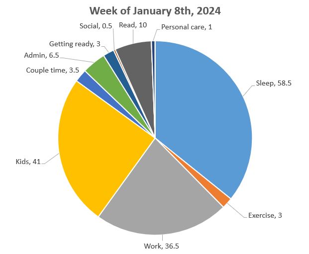 For the third year in a row, I participated in Laura Vanderkam's time tracking challenge. She's been tracking her time for something like 8+ years. I only do it once/year and don't have a desire to extend it past the week challenge but it is an interesting exercise to go through. The challenge always takes place during the same week of January each year and while there is "no typical week" in most people's lives, it can show you some trends/themes of life. Like the first year I did the time tracking challenge in 2022, I was up during the night for 5.5 hours as Taco had tubes and then, separately, got some sort of virus that resulted in high fevers during the night. I am relieved that being up at night is the exception and not the norm these days! I did have to go into his room twice last week but I was in and out - so as long as my body let me fall back asleep, that night waking didn't make the tracker. One night I could not fall back asleep so was up for 30 minutes reading (still using the lessons I learned from my "sleep training for adults" post).